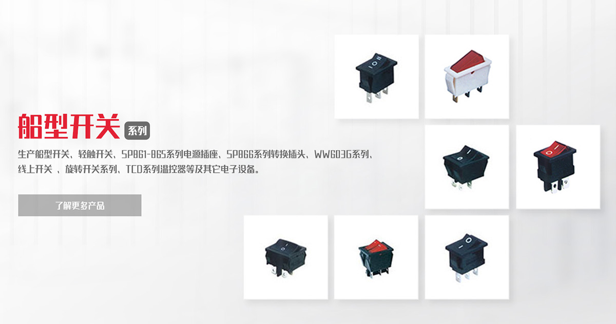 公司專業生產船型開關、輕觸開關、SP861-865系列電源插座、SP866系列轉換插頭、WW11系列微動開關、WW01-03、09系列按鈕開關DS、WW系列指示燈開關、WW603G系列 線上開關 、旋轉開關系列、TCD系列溫控器等及其它電子設備。